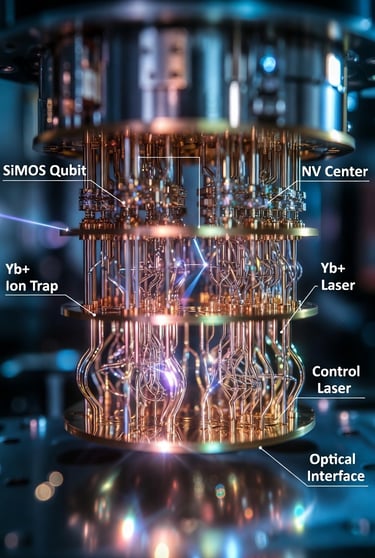 QMC-2 v2.2/v3.5-FTQC compatibility; Surface Code d=9 for QEC. It integrates hybrid qubits (SiMOS + NV + Yb⁺) with cryogenic control (FPGA <100ns latency), verifiable telemetry and reliability (MTBF/FIT ≤100). Operation: Executes in real matter (not simulation), validating laws in physical verifier.